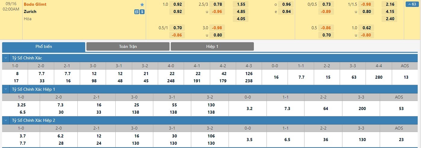 Tip kèo tỷ số hiệp 1: Bodo Glimt 1-0 FC Zurich