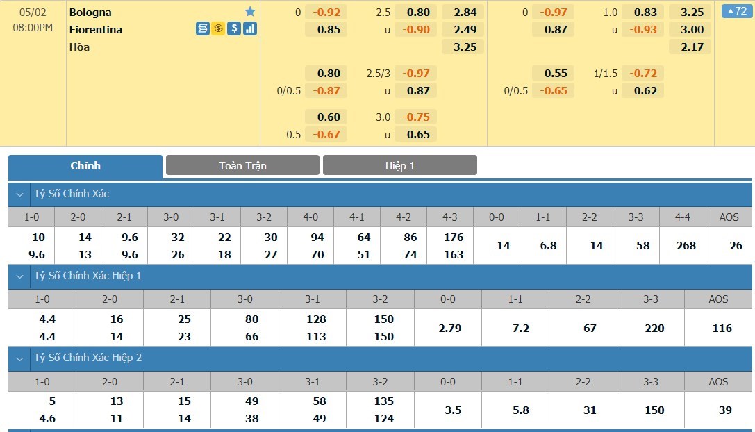 Tip kèo tỷ số hiệp 1: Bologna 0-0 Fiorentina