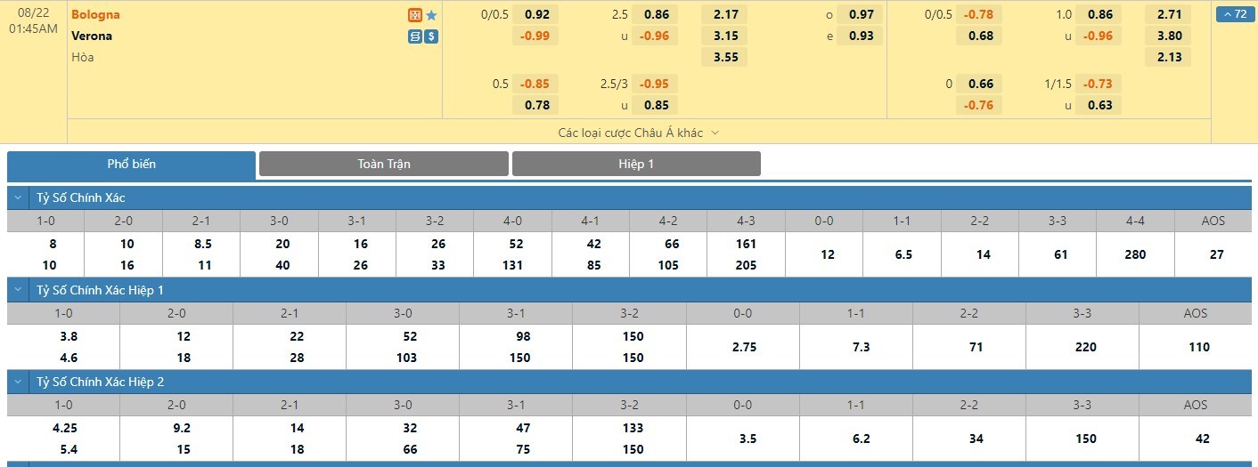 Nếu như Bologna đã có được cho mình 2 trận đấu mang về 1 bàn thắng trong hiệp đấu đầu tiên ở 5 trận gần nhất thì Hellas Verona đã có 4 lần làm được điều này. Với tỷ lệ kèo hiệp 1 là chủ nhà chấp 1/4 trái thì người chơi nên tin tưởng vào ô cược Hellas Verona để mang về cơ hội thắng cao hơn.