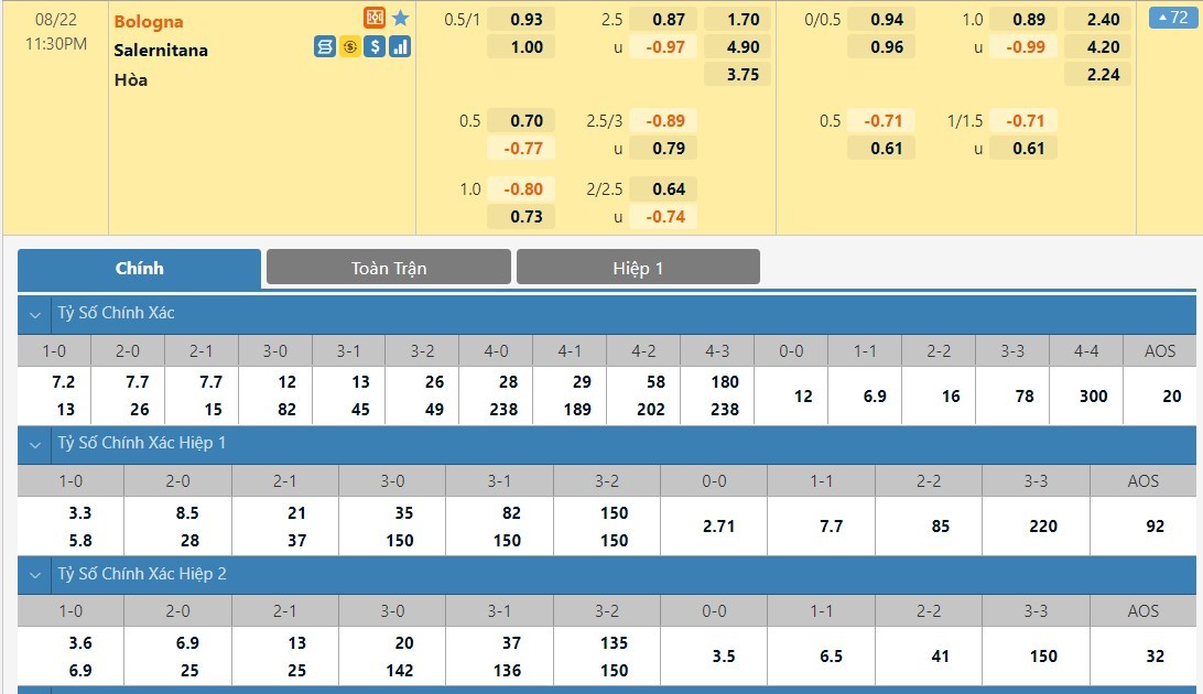 Tip kèo tỷ số full time: Bologna 1-1 Salernitana