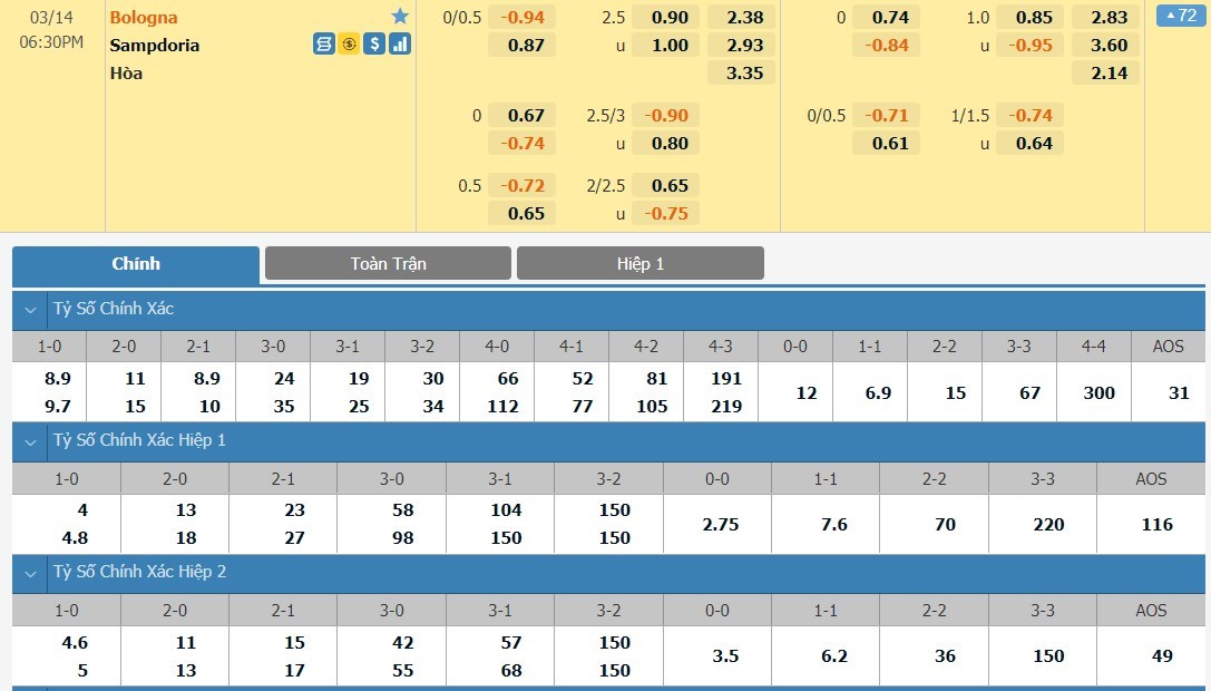 Tip kèo tỷ số hiệp 1: Bologna 2-1 Sampdoria
