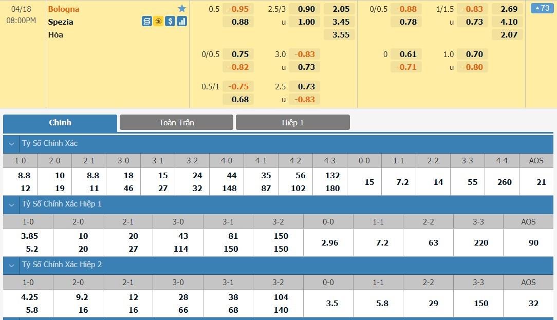 Tip kèo tỷ số hiệp 1: Bologna 0-0 Spezia