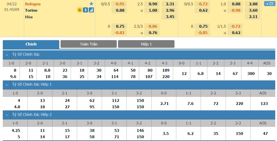 Tip kèo tỷ số hiệp 1: Bologna 1-1 Torino