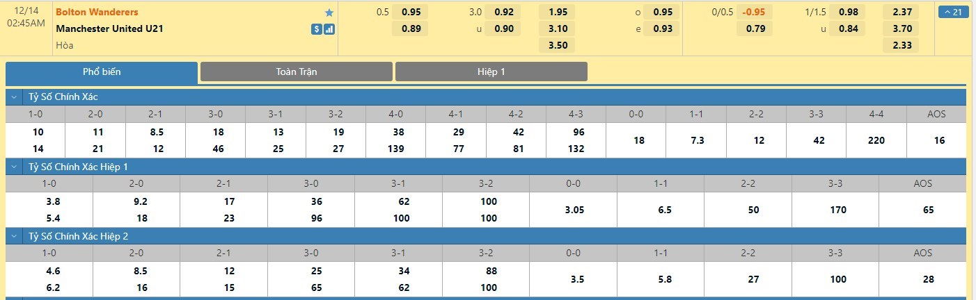 Trong 5 trận đấu gần nhất của mình, Bolton chỉ có 1 trận đấu mang về được cho mình ít nhất là 1 bàn thắng trong hiệp đấu đầu tiên. Còn với U21 Manchester United, đội bóng này chỉ có 1 lần làm được điều này trong 45 phút đầu tiên. Với tỷ lệ kèo hiệp 1 là Bolton chấp -1/4 trái thì người chơi nên tin tưởng vào đội khách trận này.