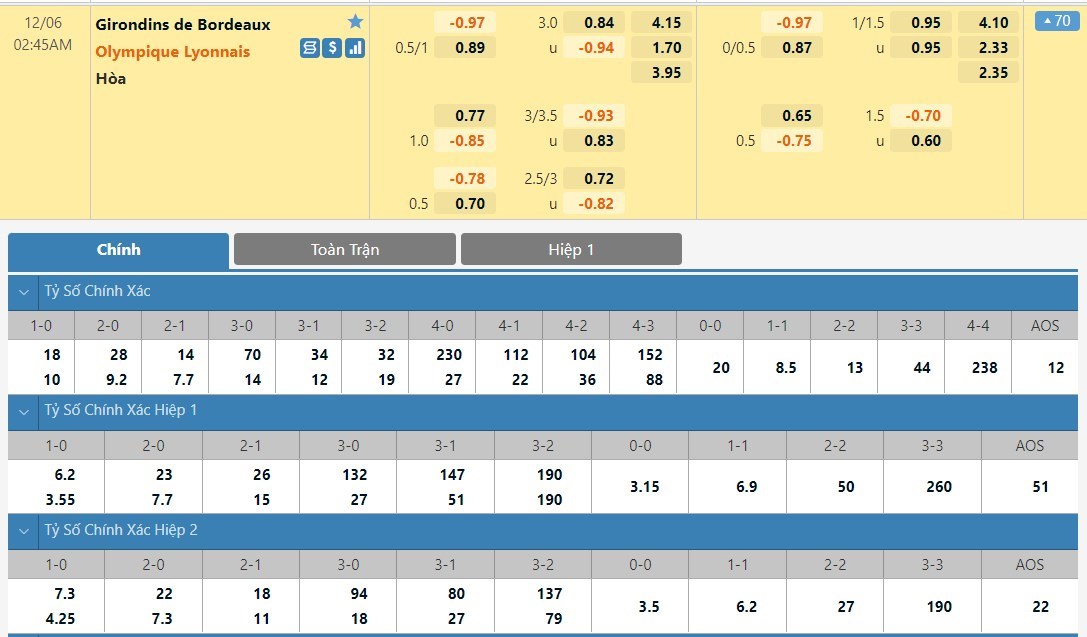 Tip kèo tỷ số hiệp 1: Bordeaux 0-1 Lyon