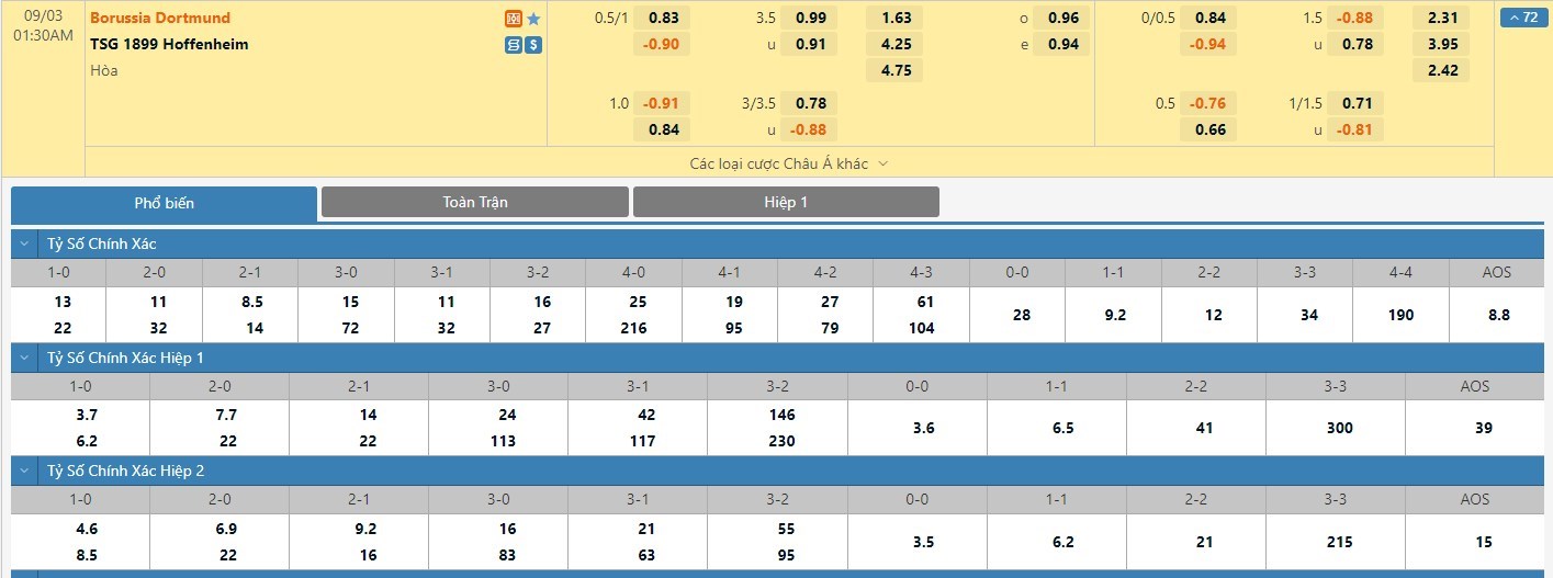Trong 5 trận đấu gần nhất hai đội bóng này chạm trán trực tiếp nhau, Dortmund đã có 2 trận đấu mang về được cho mình ít nhất là 1 bàn thắng trong hiệp đấu đầu tiên trong khi Hoffenheim đã có 3 lần làm được điều tương tự. Tỷ lệ kèo hiệp 1 ở trận đấu này được đưa ra là -1/4 trái nghiêng về đội chủ nhà và người chơi nên tin tưởng vào đội khách.
