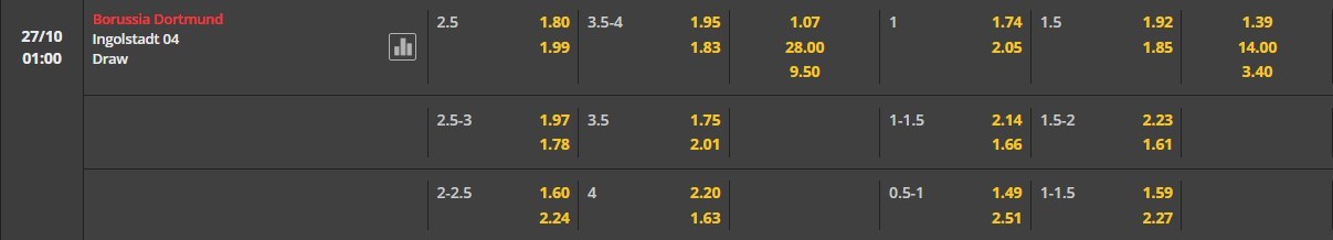 Nhà cái đưa ra mốc chấp 2 1/2 trái áp vào đội chủ sân Signal Iduna Park cũng là điều dễ lý giải. Tại sân nhà của mình, Borussia Dortmund toàn thắng 5 trận liên tiếp. Đối với một đội bóng đến từ giải hạng 2 Đức như FC Ingolstadt thì họ khó lòng nghĩ đến chuyện tạo ra bất ngờ trước đối thủ vượt trội về mọi mặt. Trong 4 lần gần nhất hai đội chạm mặt, Borussia Dortmund áp đảo với 3 chiến thắng. Cần biết thêm rằng FC Ingolstadt đã hứng chịu thất bại ở 5/6 trận đấu trên sân khách gần đây.