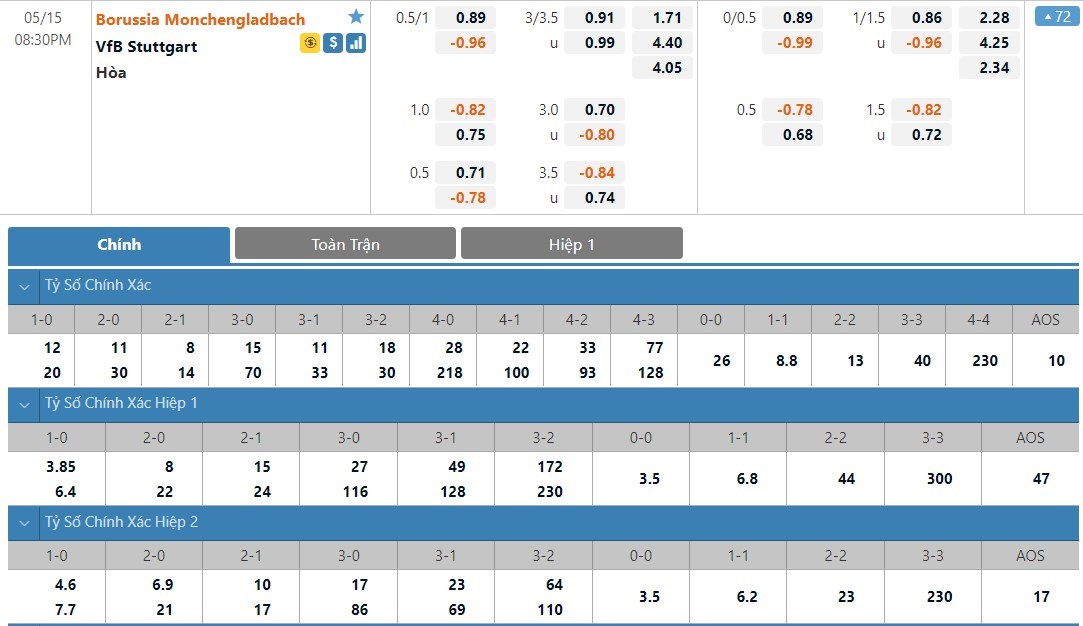 Tip kèo tỷ số hiệp 1: Borussia M.Gladbach 1-0 VfB Stuttgart
