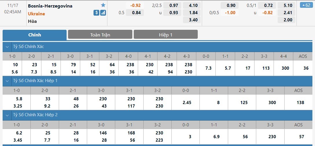Tip kèo tỷ số hiệp 1: Bosnia & Herzegovina 0-0 Ukraine