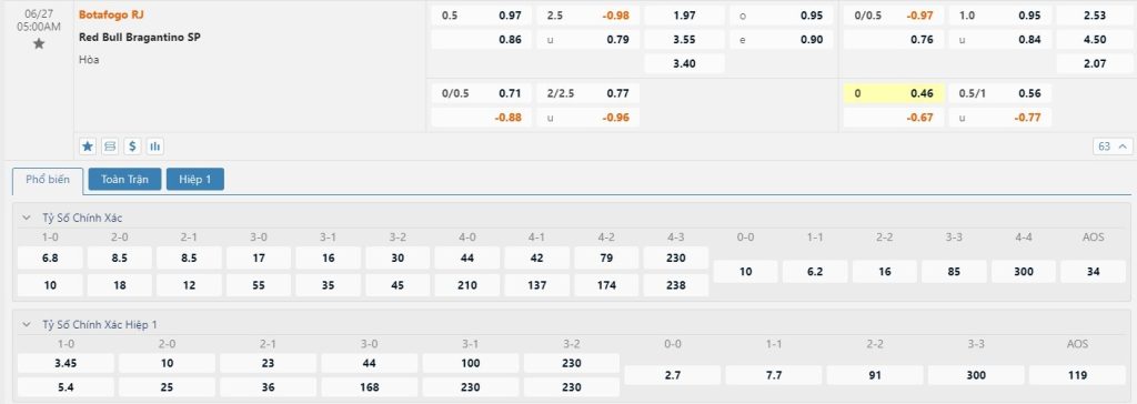 Tip kèo tỷ số hiệp 1: Botafogo 1-0 Bragantino