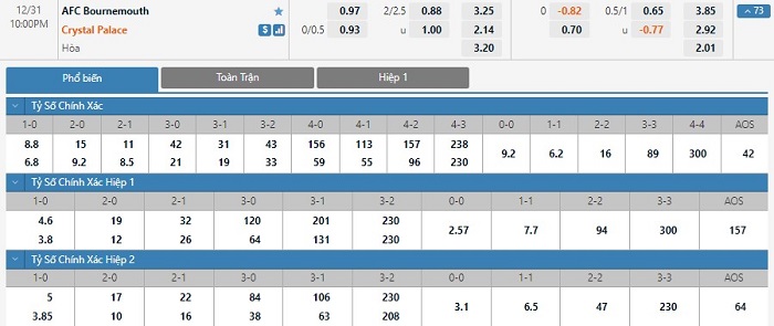 Tip kèo tỷ số hiệp 1: Bournemouth 0-1 Crystal Palace
