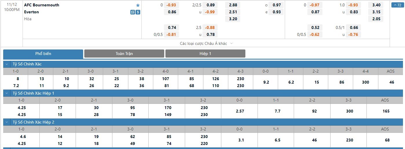 Tip kèo tỷ số hiệp 1: Bournemouth 0-0 Everton