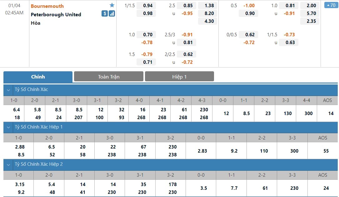 Tip kèo tỷ số hiệp 1: Bournemouth 2-0 Peterborough