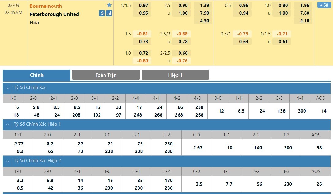 Tip kèo tỷ số hiệp 1: Bournemouth 1-0 Peterborough