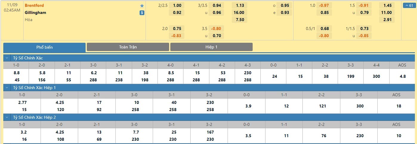 Tip kèo tỷ số hiệp 1: Brentford 2-0 Gillingham