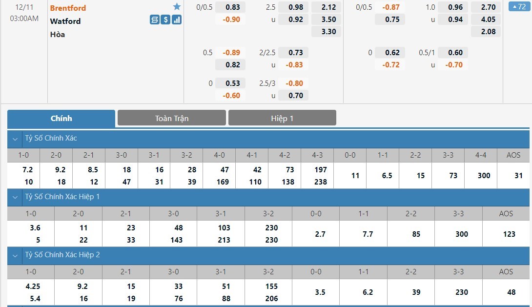 Tip kèo tỷ số hiệp 1: Brentford 1-1 Watford