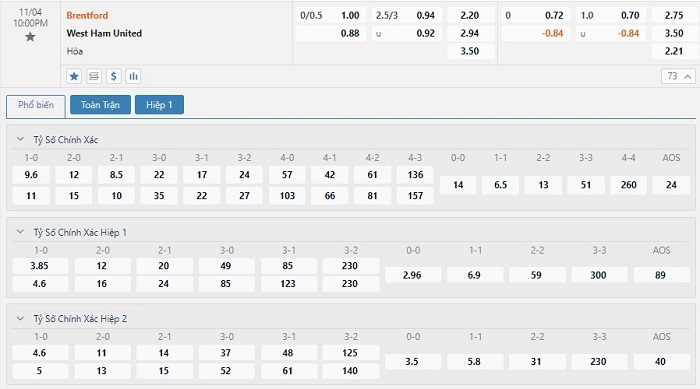 Tip kèo tỷ số full time: Brentford 1-1 West Ham United