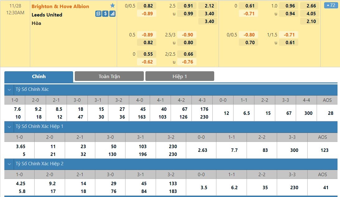 Tip kèo tỷ số hiệp 1: Brighton 1-1 Leeds United