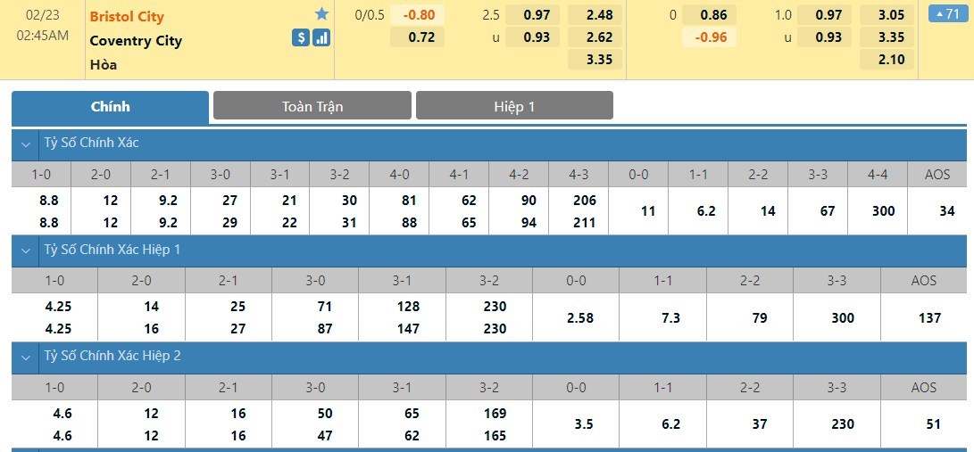 Tip kèo tỷ số hiệp 1: Bristol City 2-1 Coventry