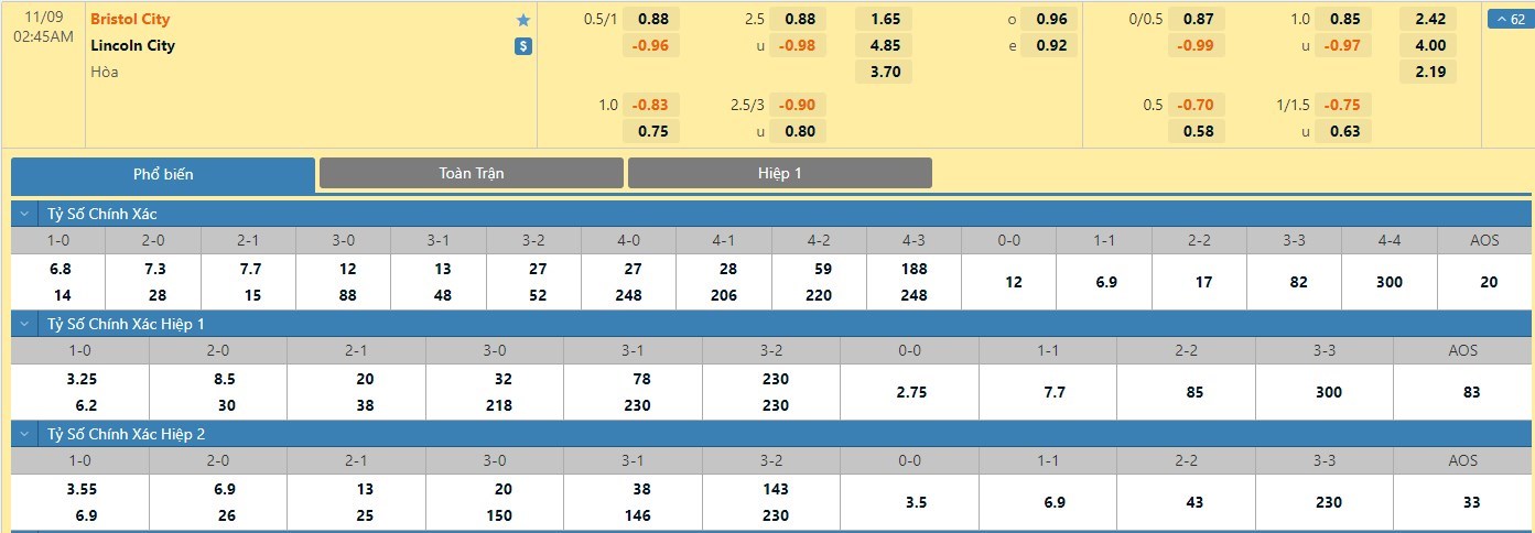 Trong 5 trận đấu gần nhất của mình, Bristol City đã có 2 trận đấu mang về được cho mình ít nhất là 1 bàn thắng trong hiệp đấu đầu tiên. Còn với Lincoln City, đội bóng này đã có 2 lần làm được điều này trong 45 phút đầu tiên. Với tỷ lệ kèo hiệp 1 ở trận đấu này được đưa ra là -1/4 trái thì người chơi nên tin tưởng vào đội chủ nhà trận này.