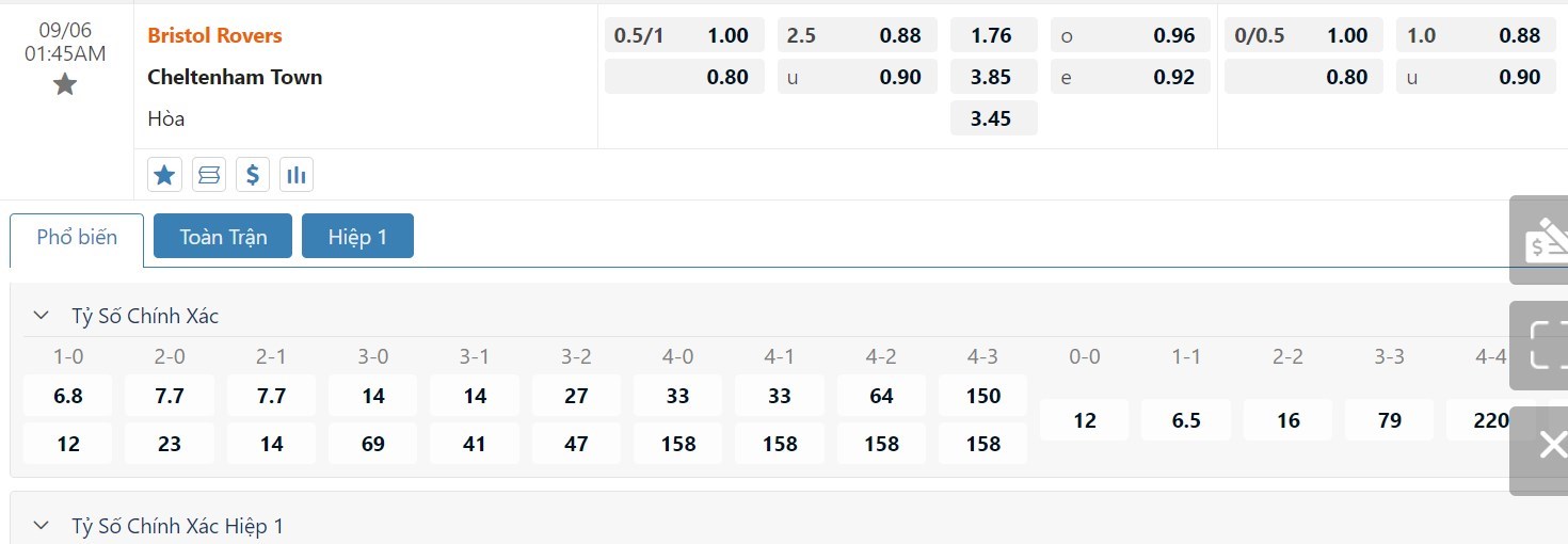 Trong 5 trận đấu gần nhất của mình, Bristol Rovers chỉ có 1 trận đấu mang về được cho mình ít nhất là 1 bàn thắng trong hiệp đấu đầu tiên. Còn với Cheltenham Town, đội bóng này đã đã không có lần nào làm được điều này trong 45 phút đầu tiên. Với tỷ lệ kèo hiệp 1 là -1/4 trái thì các nhà đầu tư nên tin tưởng vào đội chủ nhà ở trong hiệp đấu đầu tiên này.