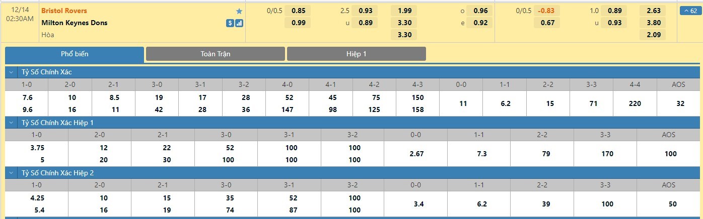 Tip kèo tỷ số hiệp 1: Bristol Rovers 2-0 Milton Keynes Dons