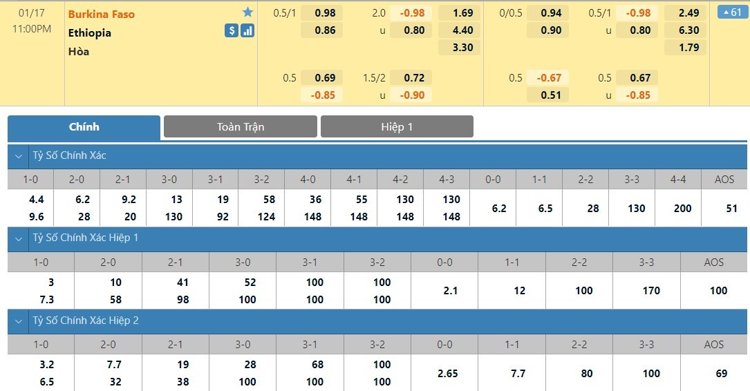 Các cầu thủ Ethiopia chơi khá quả cảm, thậm chí còn phòng ngự có phần tiêu cực để bảo vệ mảnh lưới. Việc họ gây khó khăn lên hàng công Burkina Faso là điều chắc chắn. Với kèo đấu này, giới chuyên gia nhận định khó có thể là trận đấu bùng nổ khi một bên đã xác định đá chặt, trong khi bên còn lại cũng không phải quá mạnh về tấn công. Tại kèo tài xỉu, nghiêng về Xỉu sẽ là lựa chọn an toàn hơn cho các nhà đầu tư.