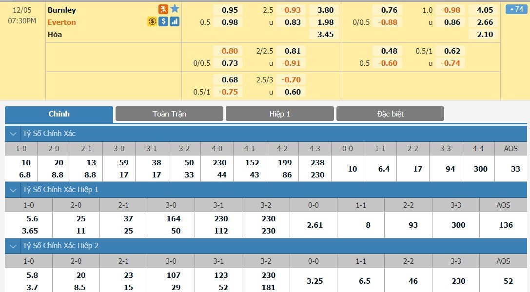 Tip kèo tỷ số hiệp 1: Burnley 0-0 Everton