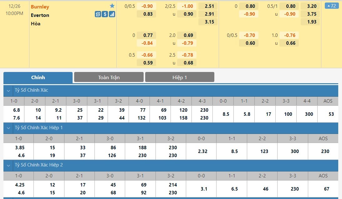 Tip kèo tỷ số hiệp 1: Burnley 0-0 Everton