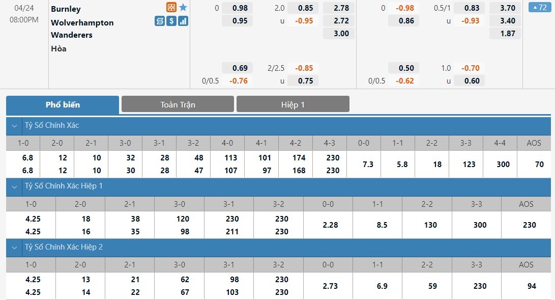 Tip kèo tỷ số hiệp 1: Burnley 0-0 Wolverhampton