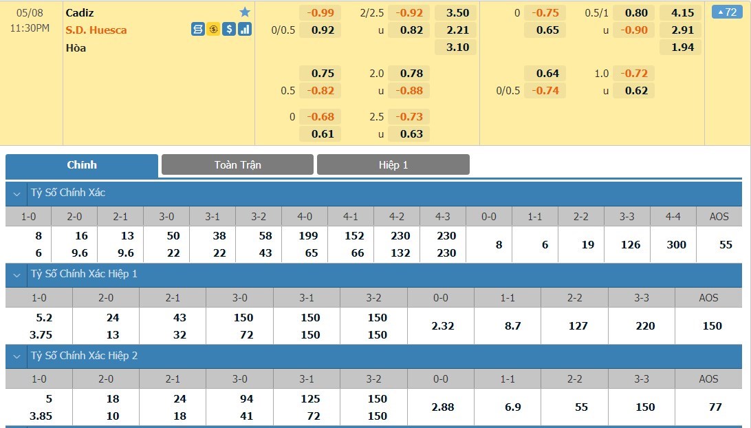 Tất nhiên, Cadiz được đánh giá cao hơn so với SD Huesca, đặc biệt là về mặt phong độ. Thế nhưng, trong một trận cầu thực sự, khó có thể đánh giá một đội bóng qua những con số thống kê. Tỷ lệ kèo của các nhà cái châu Á thì cho rằng hai đội bóng này khá cân kèo. Rất có thể hai đội sẽ duy trì thế trận hòa hoãn trong 45 phút thi đấu đầu tiên. Kèo tài xỉu của trận này cũng được ấn định là 2 1/4 bàn. Nhiều khả năng, kèo Xỉu sẽ xuất hiện và SD Huesca với quyết tâm của mình, có thể giành chiến thắng sát nút. Đáng chú ý, SD Huesca tịt ngòi trong 4 trận gần nhất và 3 bàn thắng họ ghi được đều là trong chiến thắng ở vòng 28 trước Elche.