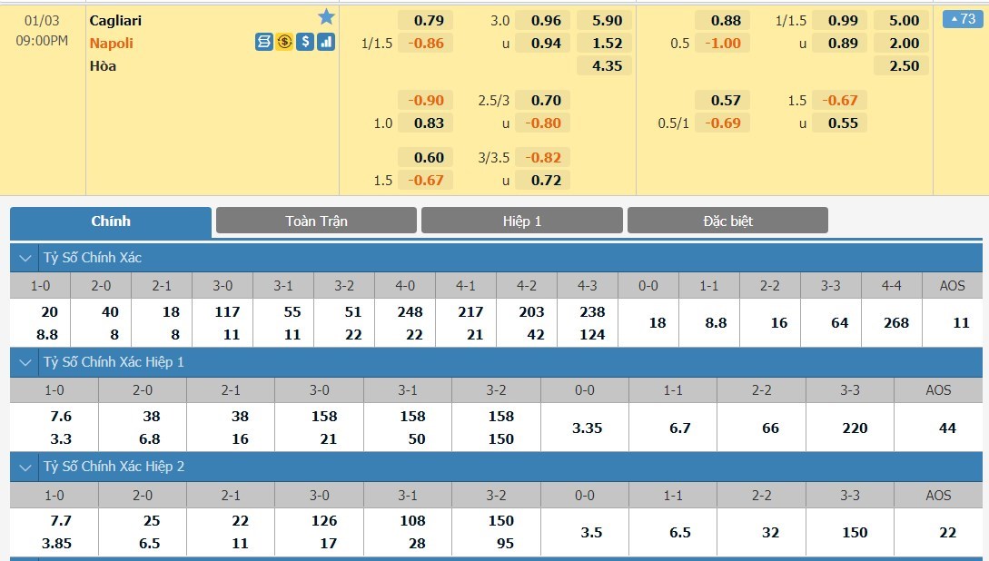 Kết thúc 45 phút đầu tiên, Cagliari có 4 lần dẫn trước, 4 hoà và 6 lần gặp bất lợi. Trong khi nếu chỉ tính trong thời gian của hiệp 1, Napoli có 5 thắng, 4 hoà và 4 thất bại. Chính vì thế, nửa đầu trận tới dự kiến sẽ có sự cân bằng về kết quả, đây có lẽ là điều làm đôi bên tạm hài lòng. Trong quá khứ, Cagliari là đội chịu lép vế rõ rệt khi họ để thua 8/10 lần gần nhất chạm mặt Napoli. Song ở lần đụng độ sắp tới, có cơ sở để cho Cagliari nghĩ đến kết quả tích cực hơn, chí ít là một trận hòa. Đây là lúc Napoli đang thi đấu không đúng sức và họ cũng là ô cược bị liệt vào danh sách đen trong con mắt các nhà đầu tư với thông số thua kèo châu Á 5 trận liên tiếp.