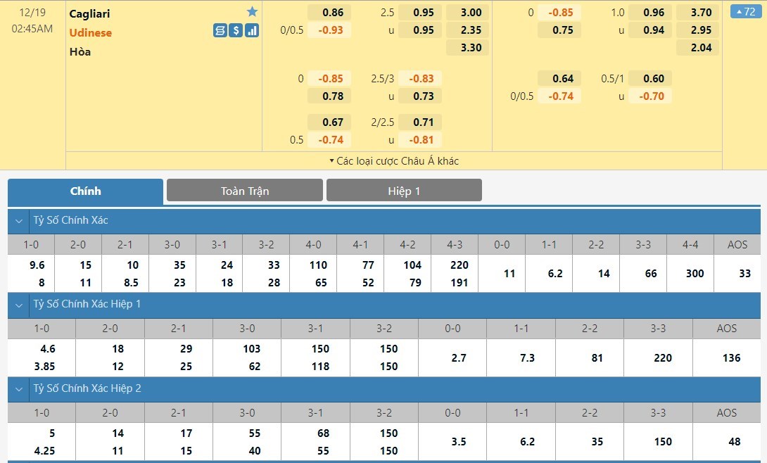 Tip kèo tỷ số hiệp 1: Cagliari 0-0 Udinese