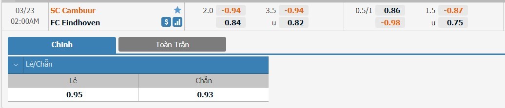 Tip kèo tỷ số hiệp 1: Cambuur 1-0 FC Eindhoven