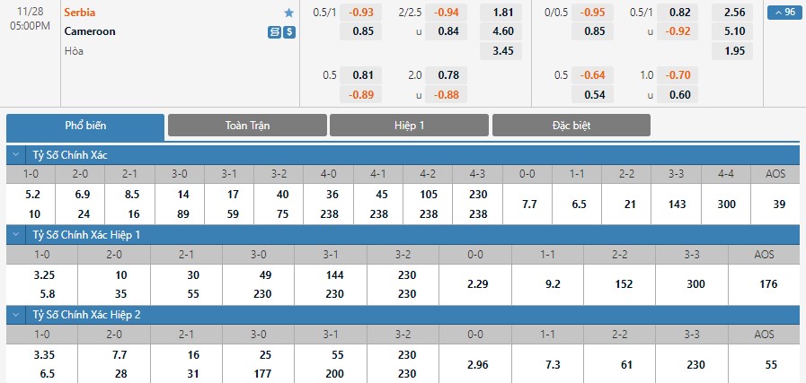Tip kèo tỷ số hiệp 1: Cameroon 0-1 Serbia