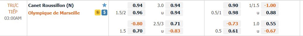 Tỷ lệ kèo chấp của trận đấu tới chắc chắn sẽ hoàn toàn thuộc về các cầu thủ đội khách. 2 lần làm khách trên sân của Canet Roussillon, Marseille hoàn toàn bất bại khi có 1 thắng và 1 hoà. Ở Ligue 1, đội bóng này có 5 thắng lợi khi xa nhà và 3 trong số đó có cách biệt từ 2 bàn trở lên. Chính vì thế ta có thể đặt niềm tin vào thầy trò Villas Boas trận đấu này.