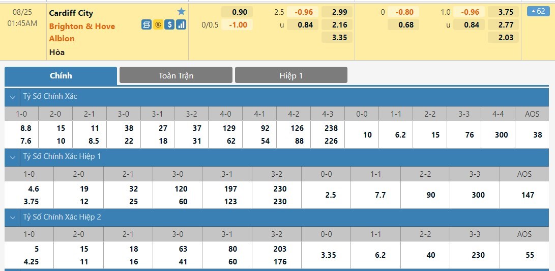 Lần gần nhất hai đội chạm trán với nhau là khi họ cùng chơi tại giải Ngoại hạng Anh mùa bóng 2018/19. Khi đó, Cardiff toàn thắng cả 2 lượt trận gặp Brighton. Tuy nhiên, tình thế hiện tại lại không ủng hộ cho Cardiff. Nhà cái dành cho Brighton vị thế chiếu trên chấp ngược chủ nhà mốc tỷ lệ 1/4 trái. Rõ ràng là việc Cardiff hiện tại đang chơi ở giải hạng Nhất Anh, còn Brighton vẫn bám trụ tại sân chơi Ngoại hạng Anh là nguyên nhân chính ảnh hưởng tới cách nhìn nhận của đội ngũ thiết lập tỷ lệ.
