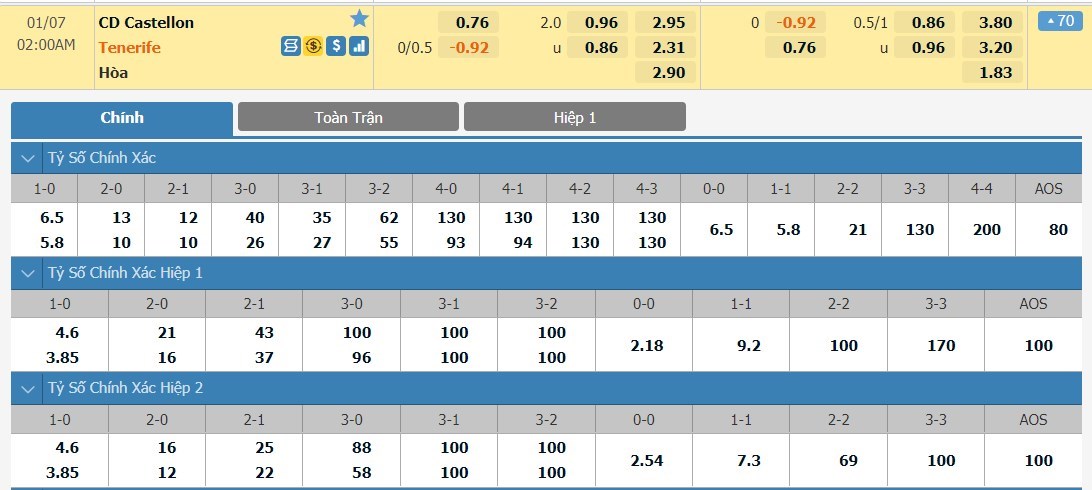 Tip kèo tỷ số hiệp 1: Castellon 0-1 Tenerife