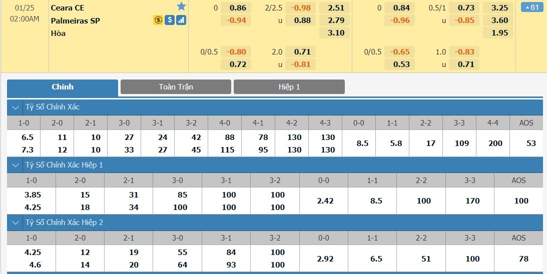 Tip kèo tỷ số hiệp 1: Ceara 1-1 Palmeiras