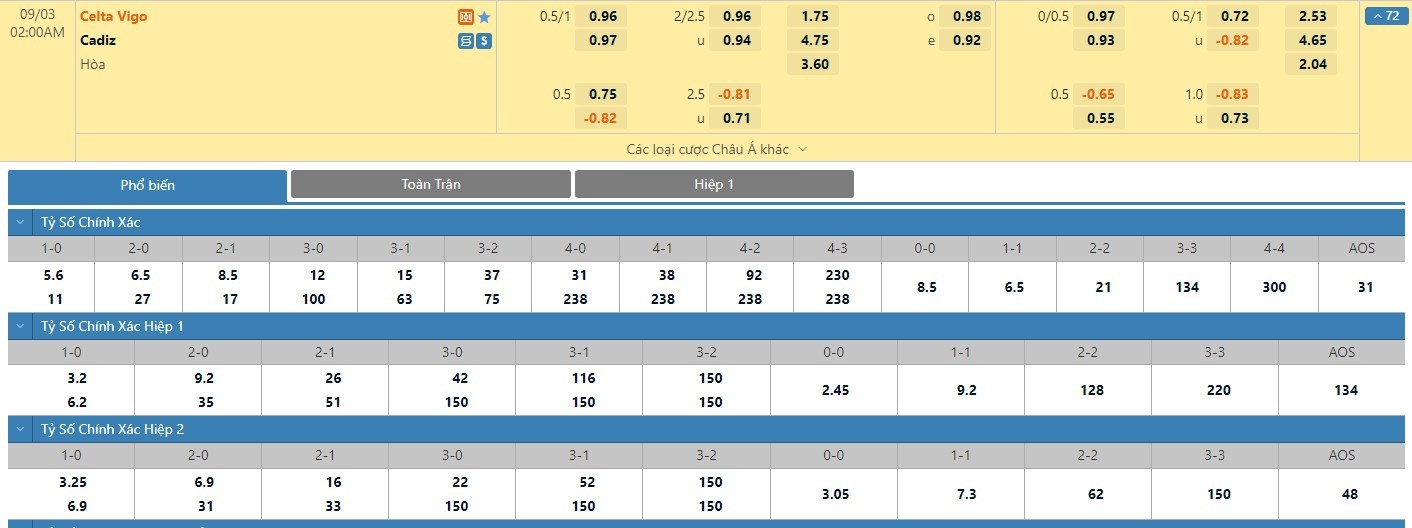 Trong 5 trận đấu gần nhất hai đội bóng này chạm trán trực tiếp nhau, Celta Vigo đã có 2 trận đấu mang về được cho mình ít nhất là 1 bàn thắng trong hiệp đấu đầu tiên. Còn với Cadiz thì đội bóng này chỉ có 1 lần làm được điều tương tự. Tỷ lệ kèo hiệp 1 ở trận đấu này được đưa ra là Celta Vigo chấp -1/4 trái và người chơi nên tin tưởng vào đội chủ nhà.