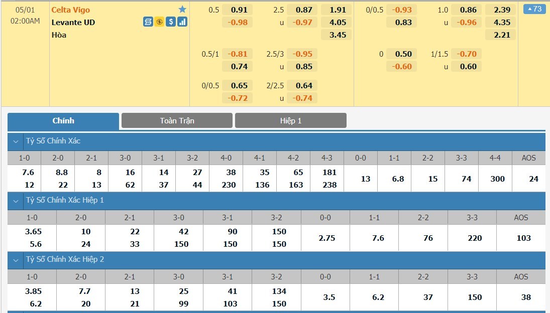 Tip kèo tỷ số hiệp 1: Celta Vigo 1-0 Levante