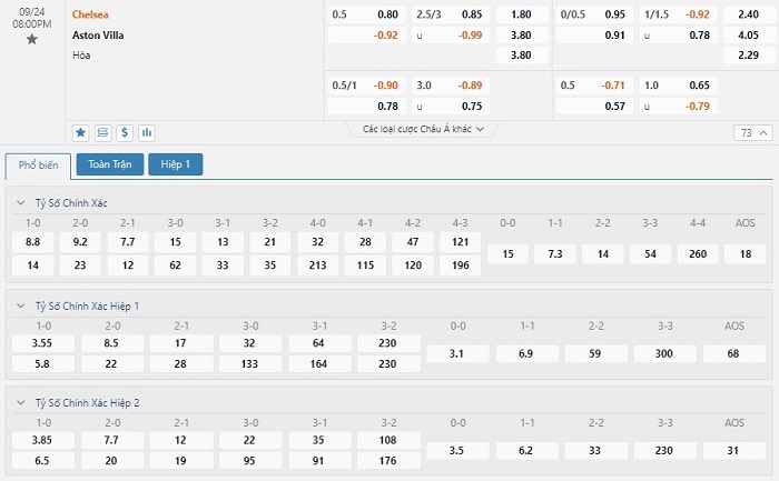 Tip kèo tỷ số full time: Chelsea 1-0 Aston Villa