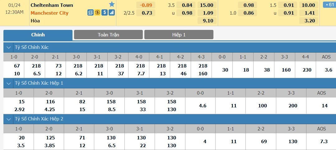 Tip kèo tỷ số hiệp 1: Cheltenham 0-2 Manchester City