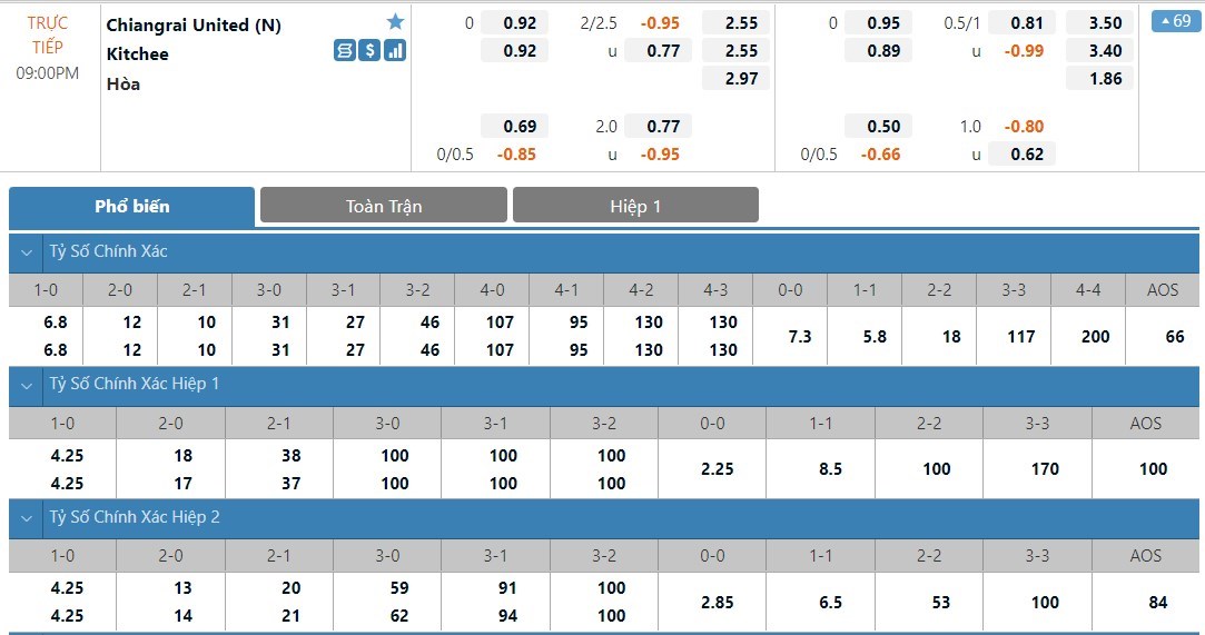 Tip kèo tỷ số hiệp 1: Chiangrai United 0-0 Kitchee