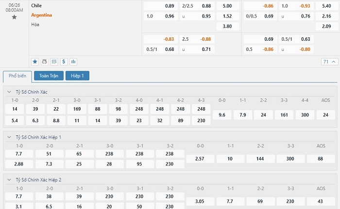 Tip kèo tỷ số hiệp 1: Chile 0-1 Argentina