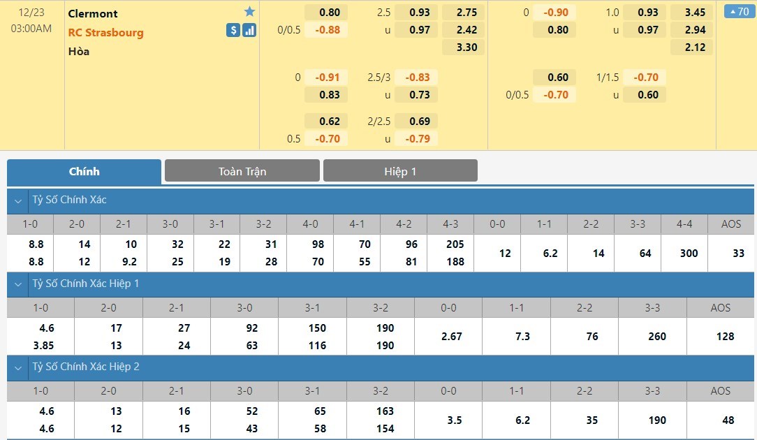 Tip kèo tỷ số hiệp 1: Clermont Foot 0-0 Strasbourg