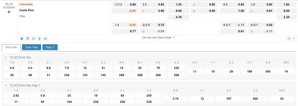 Tip kèo tỷ số hiệp 1: Colombia 1-0 Costa Rica