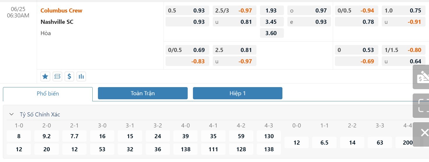 Tip kèo tỷ số hiệp 1: Columbus Crew 0-0 Nashville SC
