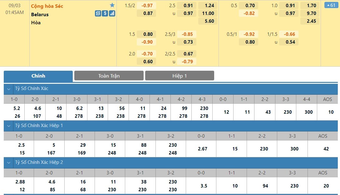 Tip kèo tỷ số hiệp 1: Cộng hòa Séc 1-0 Belarus
