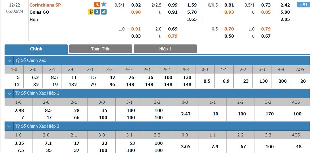 Tip kèo tỷ số hiệp 1: Corinthians 1-0 Goias